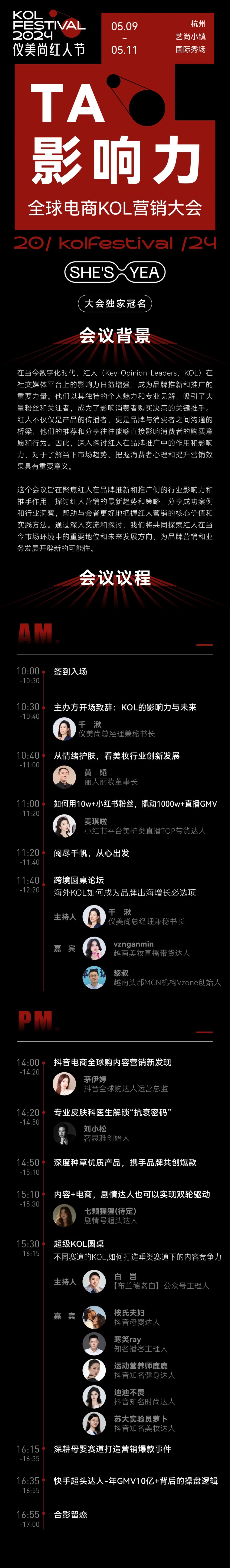 在5月9日,由SHE’S YEA独家冠名的“「TA影响力」全球电商KOL营销大会”上,多位品牌操盘手将结合实例阐述经营方法论,各平台头部达人也将从种草、共创、爆品打造等维度分享成功经验,更有两大圆桌论坛,将就“出海赋能”及“垂类赛道竞争力打造”等主题展开深度交流。