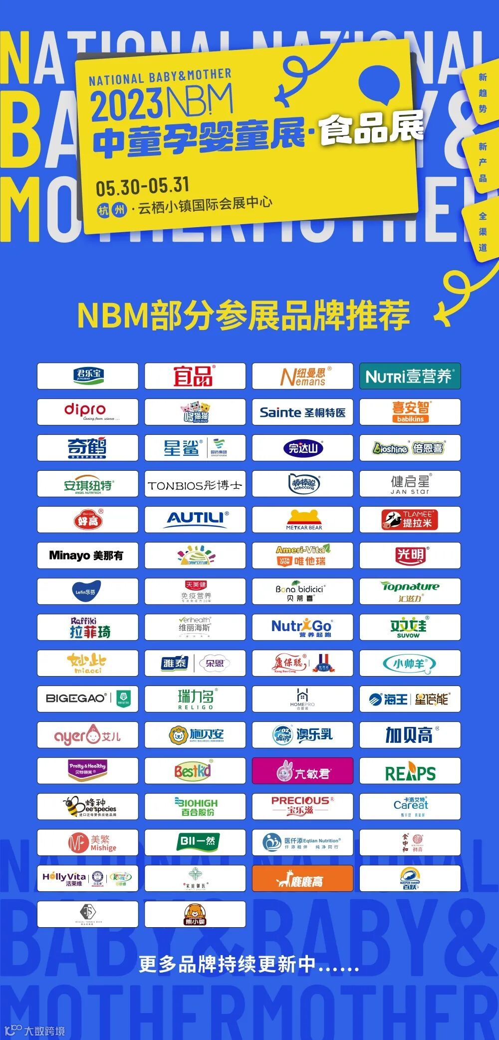 2023年NBM中童孕婴展·食品展,将于2023年5月30-31日落地杭州,着重于孕婴童食品相关的产品,包括奶粉、营养品、零辅食、孕产妇食品、食品供应链等;2023年11月1日-2日将落地广州,着重于孕婴童全品类产品,包括母婴食品、母婴用品、棉品鞋服、纸品、玩具益智、孕婴童产品供应链等。NBM中童孕婴展是全行业最聚焦、最精准的展会,让招商和选品对接更有效率。