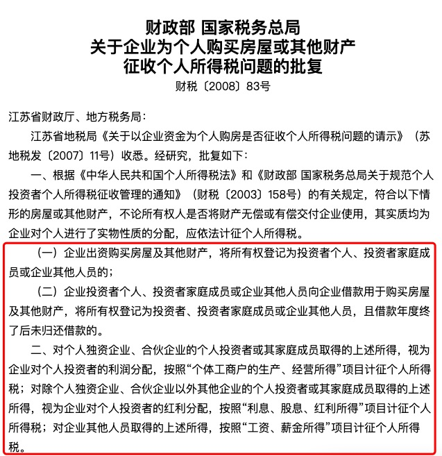 3.任职、受雇的企业人员在《财政部、国家税务总局关于企业为个人购买房屋或其他财产征收个人所得税问题的批复》(财税〔2008〕83号)》中明确规定: