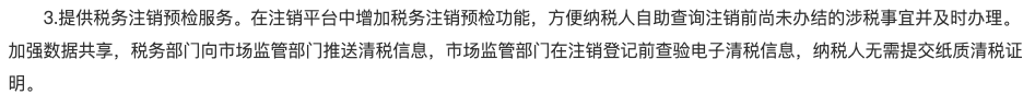 在注销平台中增加税务注销预检功能,方便纳税人自助查询注销前尚未办结的涉税事宜并及时办理。加强数据共享,税务部门向市场监管部门推送清税信息,市场监管部门在注销登记前查验电子清税信息,纳税人无需提交纸质清税证明。