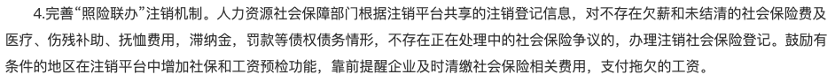 人力资源社会保障部门根据注销平台共享的注销登记信息,对不存在欠薪和未结清的社会保险费及医疗、伤残补助、抚恤费用,滞纳金,罚款等债权债务情形,不存在正在处理中的社会保险争议的,办理注销社会保险登记。
