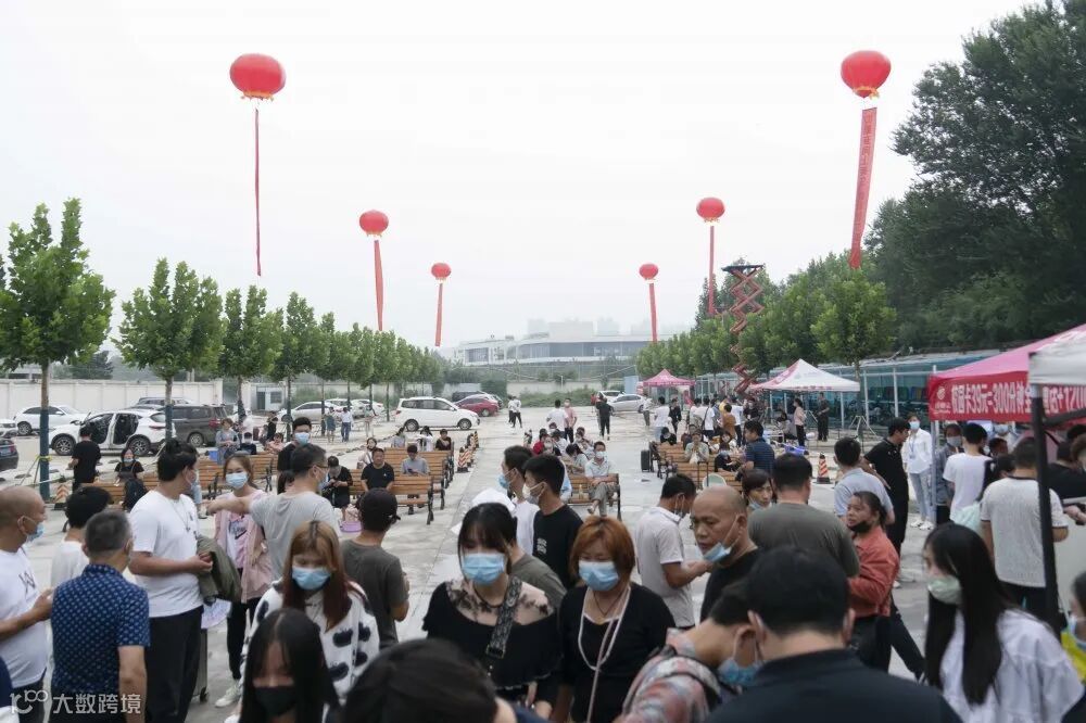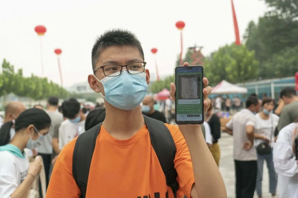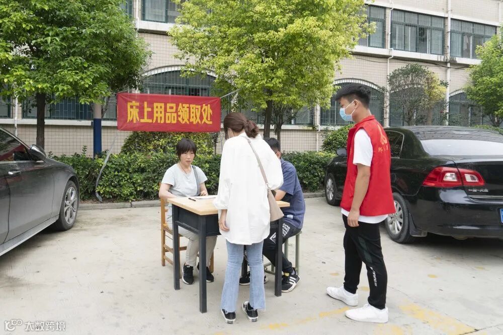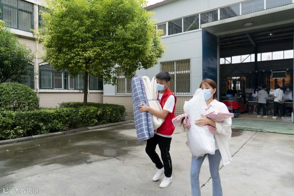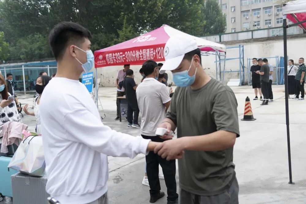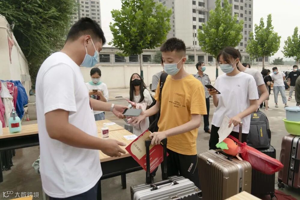 在工作人员的指引下,同学们自觉配套口罩、间隔排队,经过身份查验、体温测量、行程码核查、行李消毒等环节后,平稳有序进入校园。
