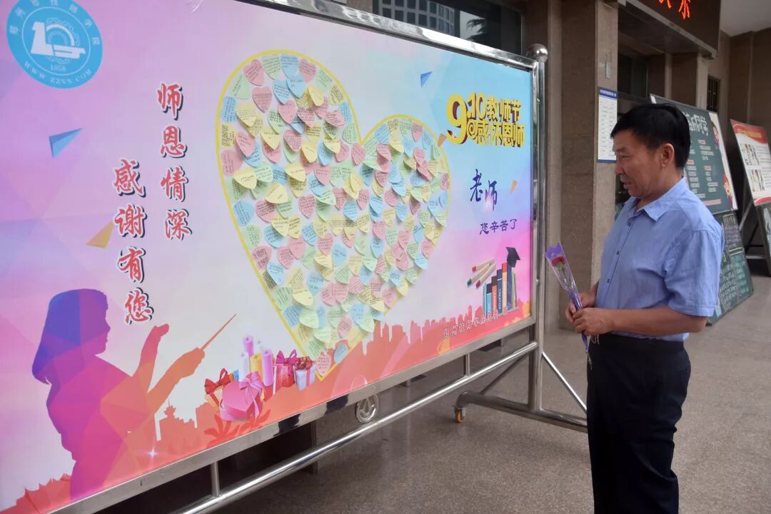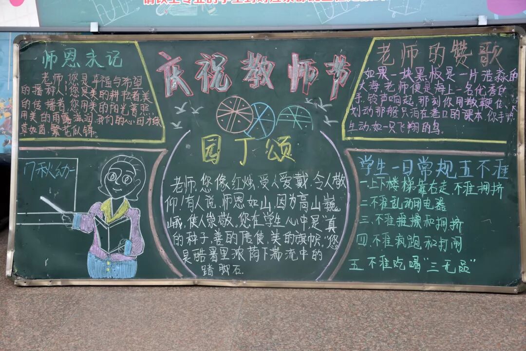 升国旗仪式上,学生进行了以“师恩情深”为主题的国旗下演讲;在教室里,一支鲜花、一棵小盆栽、一包润喉糖、一杯热水、一张贺卡、一幅铅笔画的爱心礼物以及创意黑板报让每位老师都真切感受到同学们祝福;