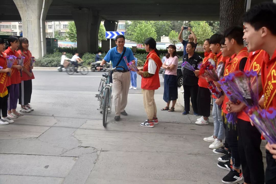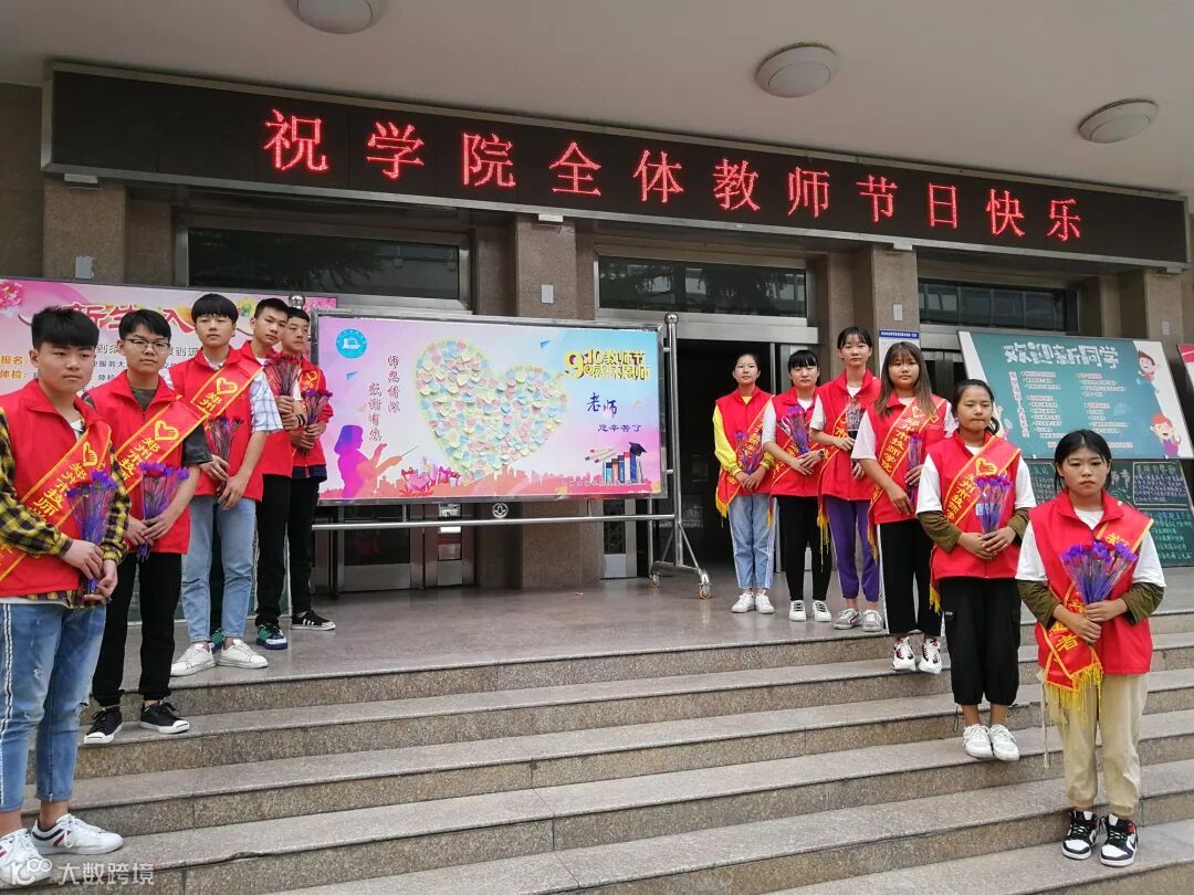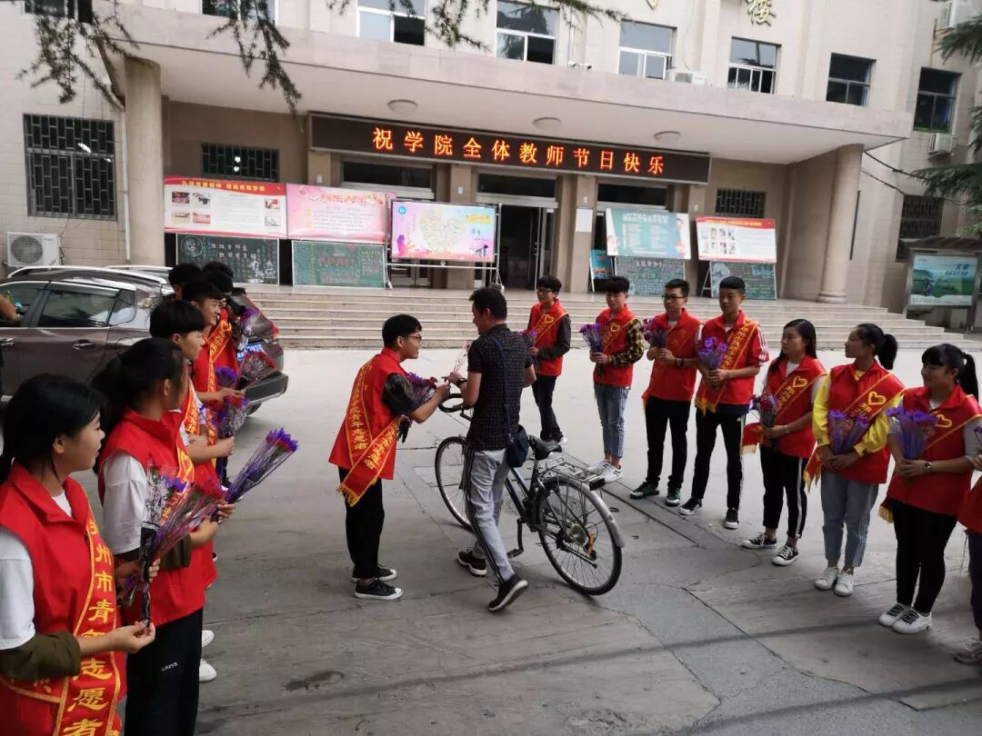 9月9日,在院团委的号召下,各班学生向事先准备好的祝福板上张贴祝福语,字里行间、声声祝福都表达了对老师的深切感情和真挚祝愿;9月10日一大早,同学们披上肩带,拿上鲜花,整齐的站在学院门口两侧,等待着每一位来上班的老师,送上教师节最早的鲜花和祝福;