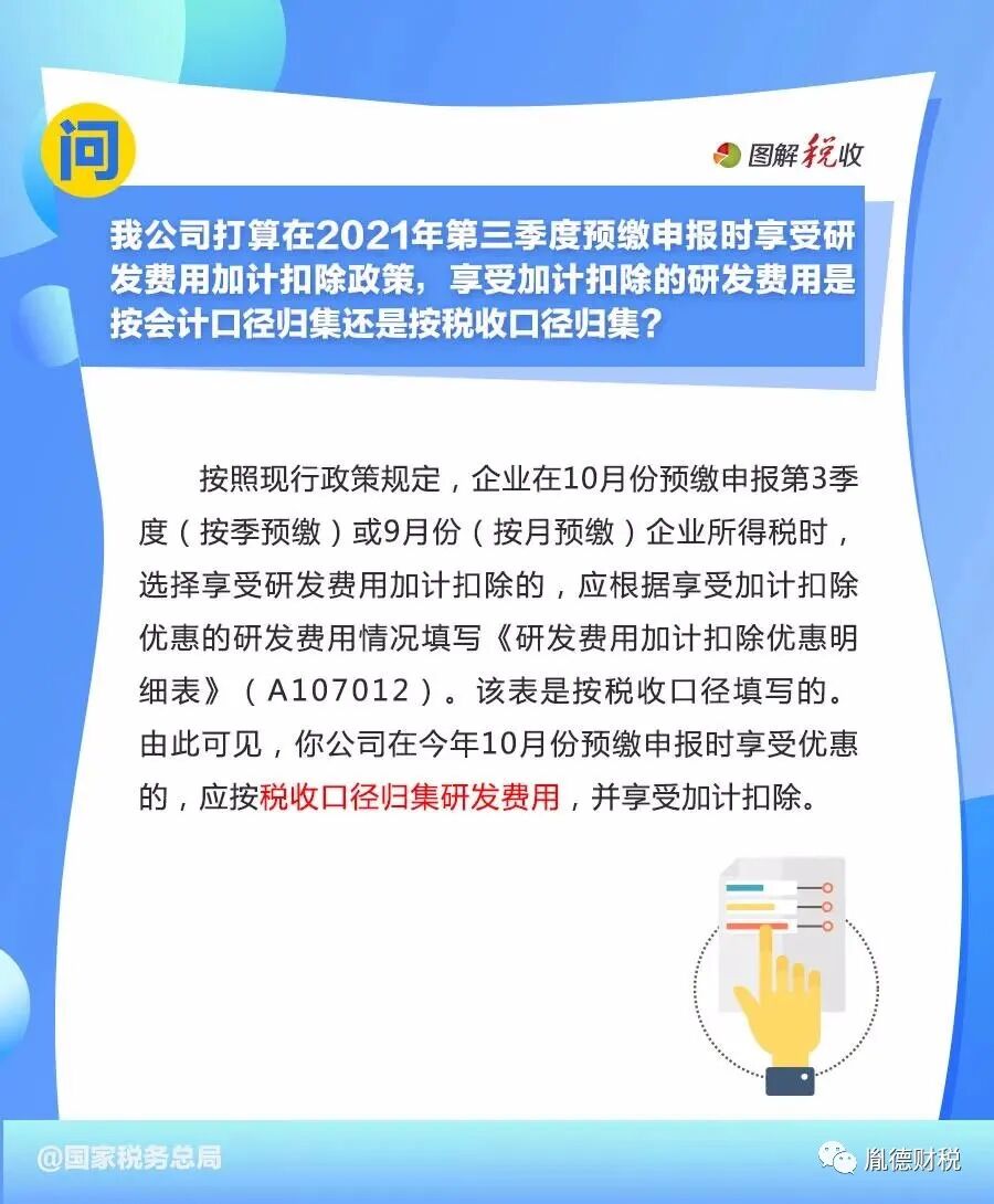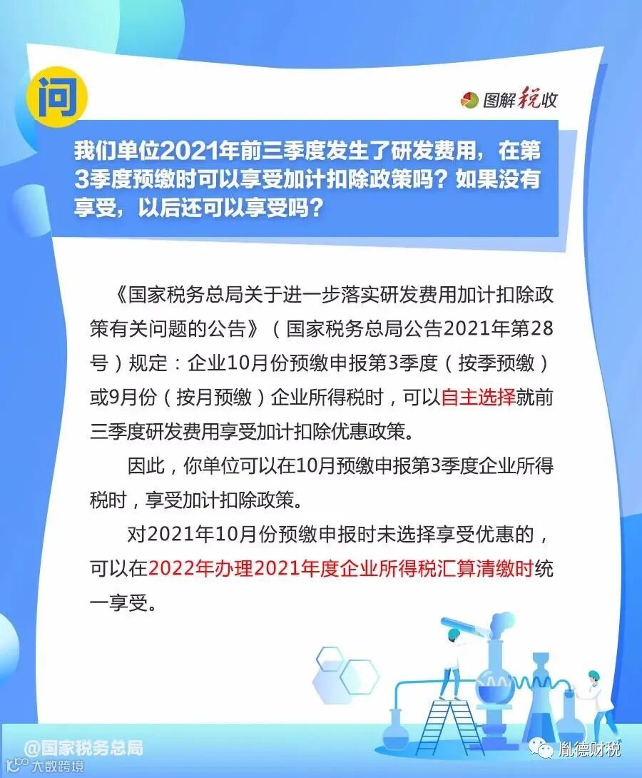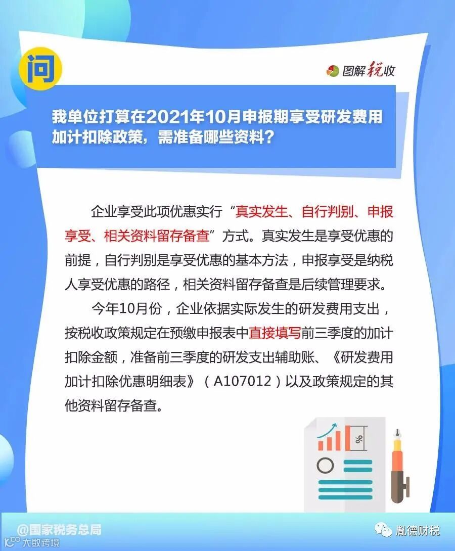 为进一步提升企业研发积极性,激发企业创新活力,国家税务总局日前发布《关于进一步落实研发费用加计扣除政策有关问题的公告》(国家税务总局公告2021年第28号)明确,2021年10月份纳税申报期,在允许企业享受上半年研发费用加计扣除的基础上,再增加一个季度的优惠。目前正值10月大征期,企业享受研发费用加计扣除优惠,这9个问答能帮你↓