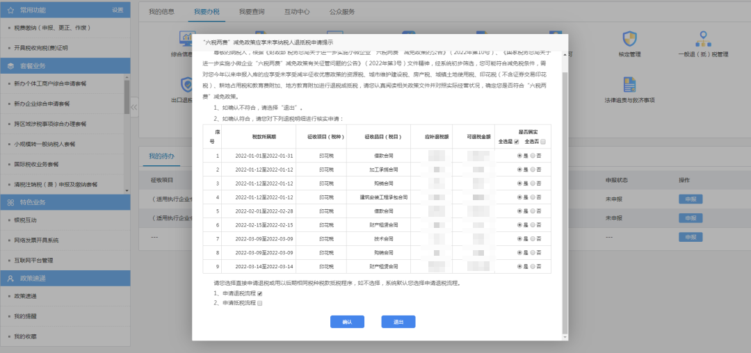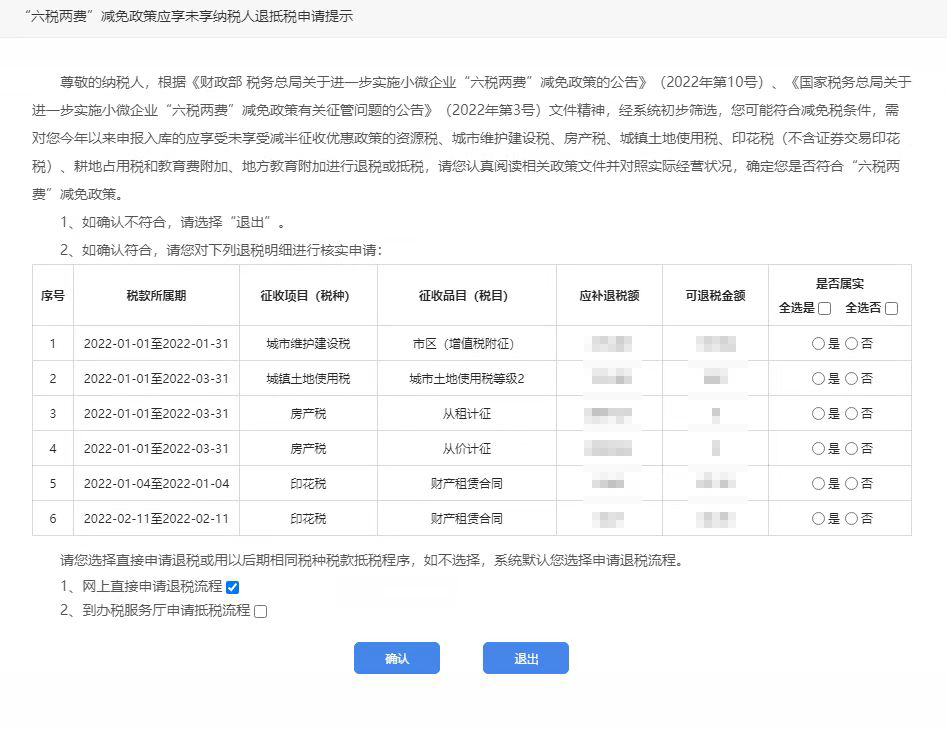 请您对下列退税(费)明细进行逐条核实。税款所属期、征收项目(税种)、征收品目(税种)、应补退税额、可退税金额信息为系统自动带出。如属实,请选择“是”。如不属实,请选择“否”。