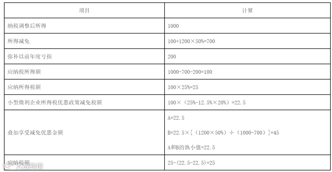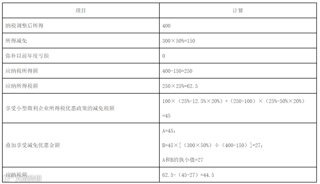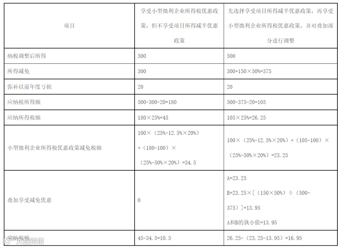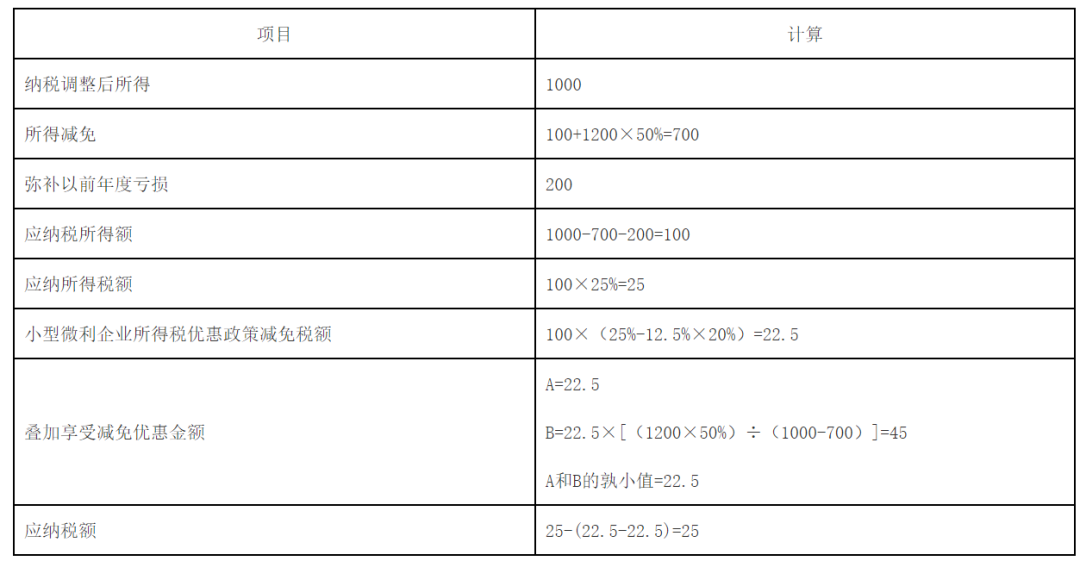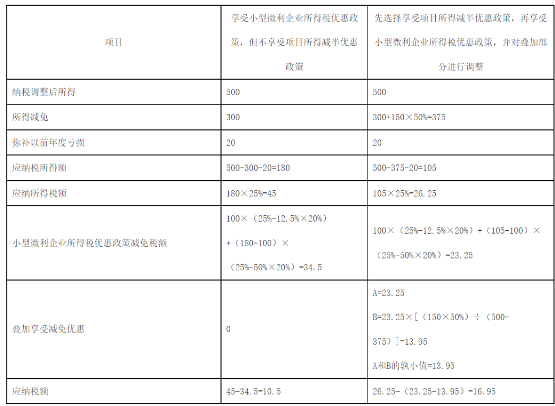 下面,以小型微利企业为例说明叠加享受减免税优惠的计算方法。企业选择享受其他减免所得税优惠政策,可据此类推。