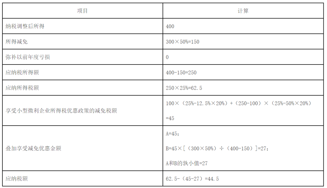 【例1】甲公司从事非国家限制或禁止行业,2021年度的资产总额、从业人数符合小型微利企业条件,纳税调整后所得400万元,其中300万元是符合所得减半征收条件的花卉种植项目所得。甲公司以前年度结转待弥补亏损为0,不享受其他减免所得税额的优惠政策。此时,甲公司应先选择享受项目所得减半优惠政策,再享受小型微利企业所得税优惠政策,并对叠加享受减免税优惠部分进行调整,计算结果如下: