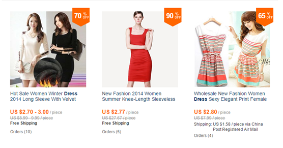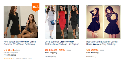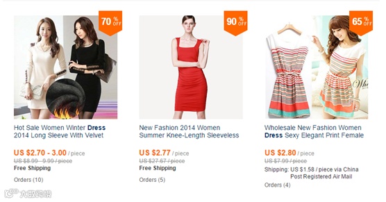 首先本人是做女装的,众所周知,女装这个品类现在是速卖通里厮杀最激烈的,很多家价格低的离谱,让很多小伙伴已经产生了生理错觉(也就是条件反射),必须低价才能卖的好,才能多开单。一旦问起做好速卖通的必杀绝招,恨不得一口同声,大声呐喊:1.99$包邮。好比是挖掘机哪家强这种江湖流传的对口,每天不喊一遍,浑身都不对劲。不得不承认现在价格战打的确实是凶狠。我随便做了些截图: