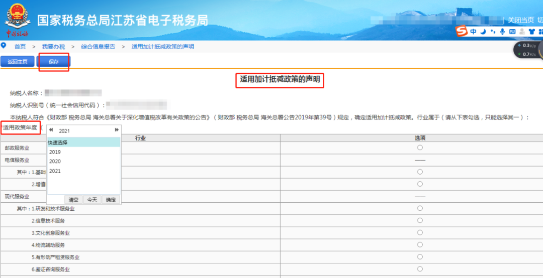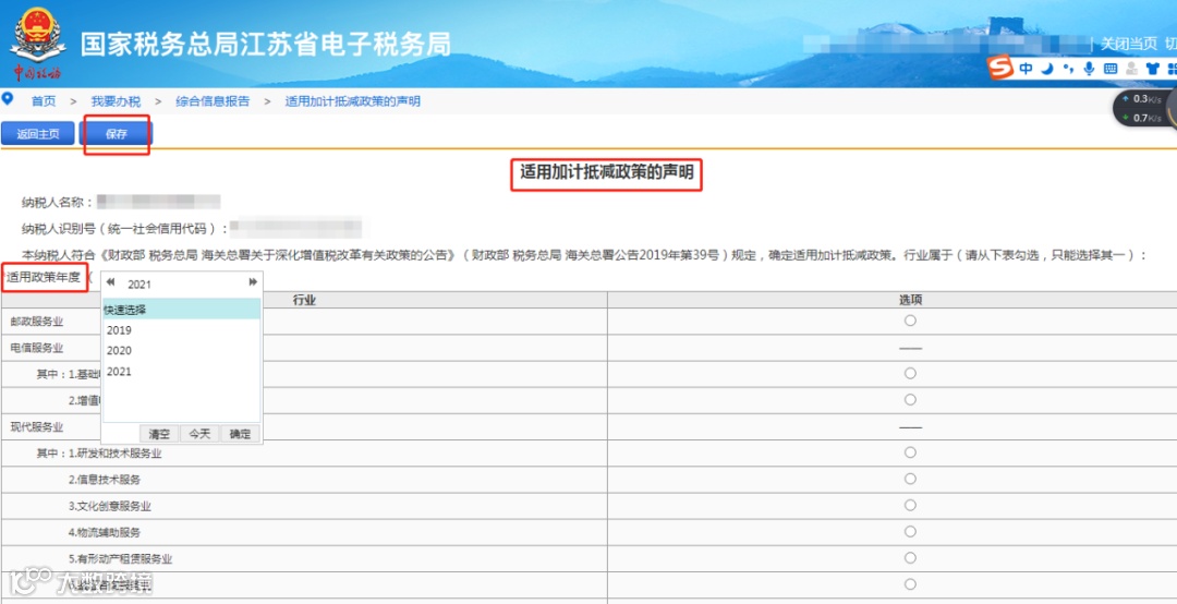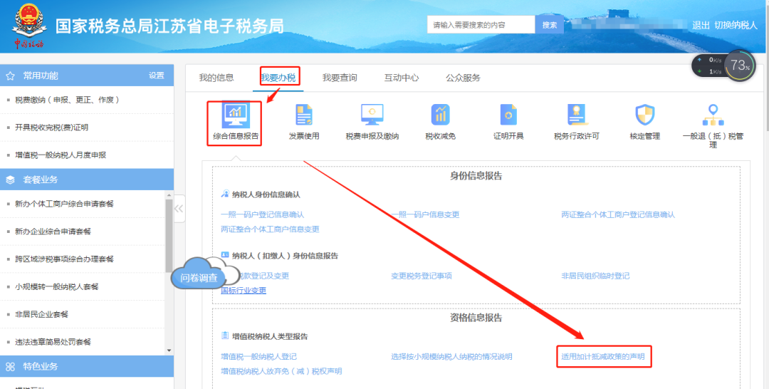 登录江苏省电子税务局——我要办税——综合信息报告——适用加计抵减政策的声明——选择对应的模块进入——选择适用政策年度——填写并保存提交。