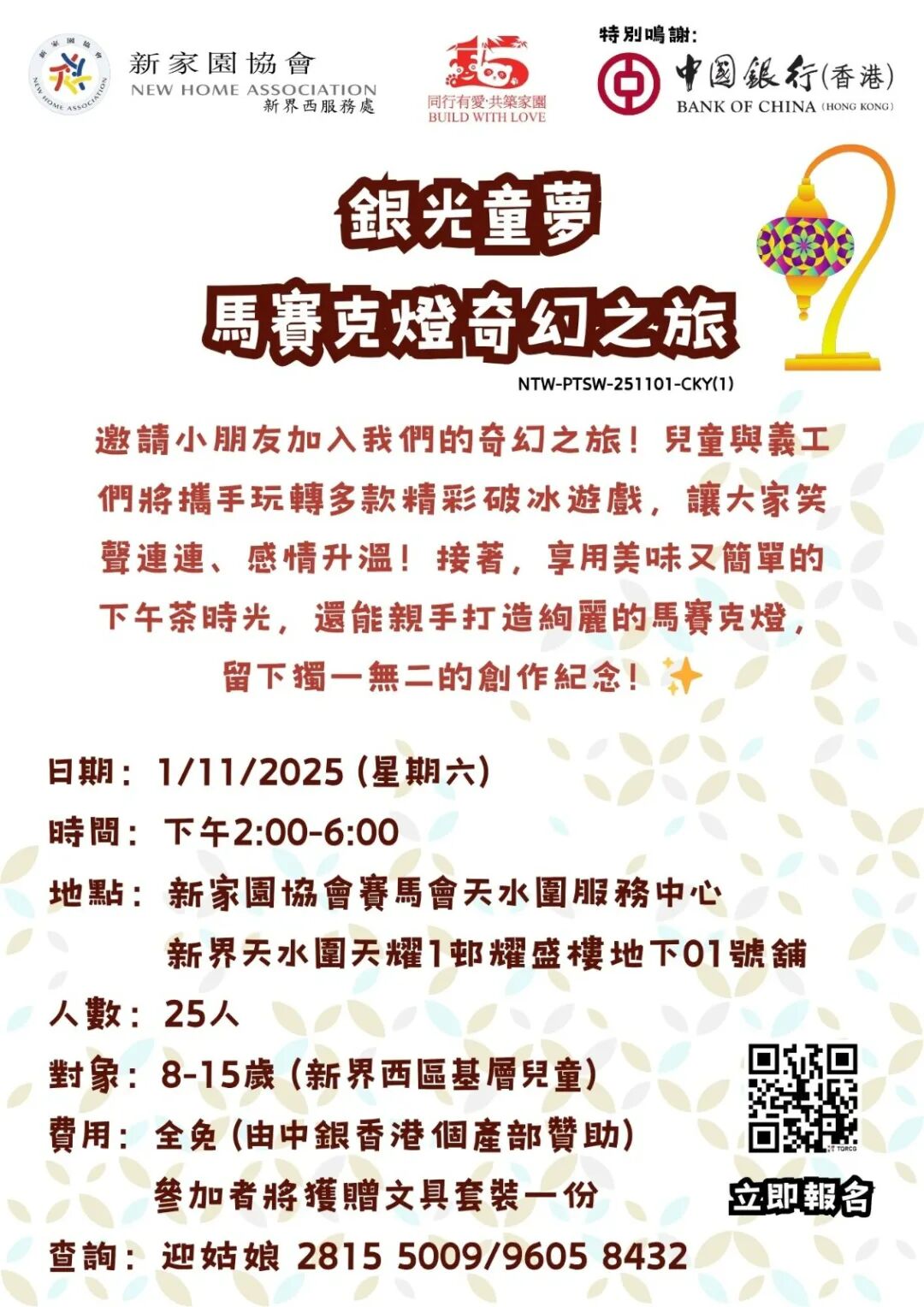 邀請小朋友加入我們的奇幻之旅!兒童與義工們將攜手玩轉多款精彩破冰遊戲,讓大家笑聲連連、感情升溫!接著,享用美味又簡單的下午茶時光,還能親手打造絢麗的馬賽克燈,留下獨一無二的創作紀念!✨