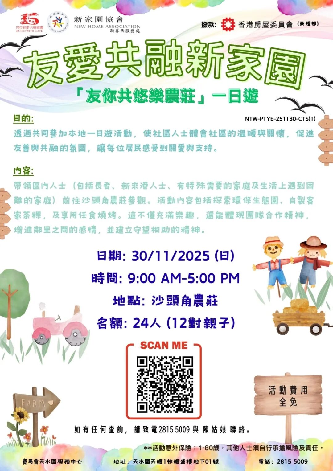 🙌 內容: 帶領區內人士(包括長者、新來港人士、有特殊需要的家庭及生活上遇到困難的家庭)前往沙頭角農莊參觀。活動內容包括探索環保生態園、自製客家茶粿,及享用任食燒烤。這不僅充滿樂趣,還能體現團隊合作精神,增進鄰里之間的感情,並建立守望相助的精神。