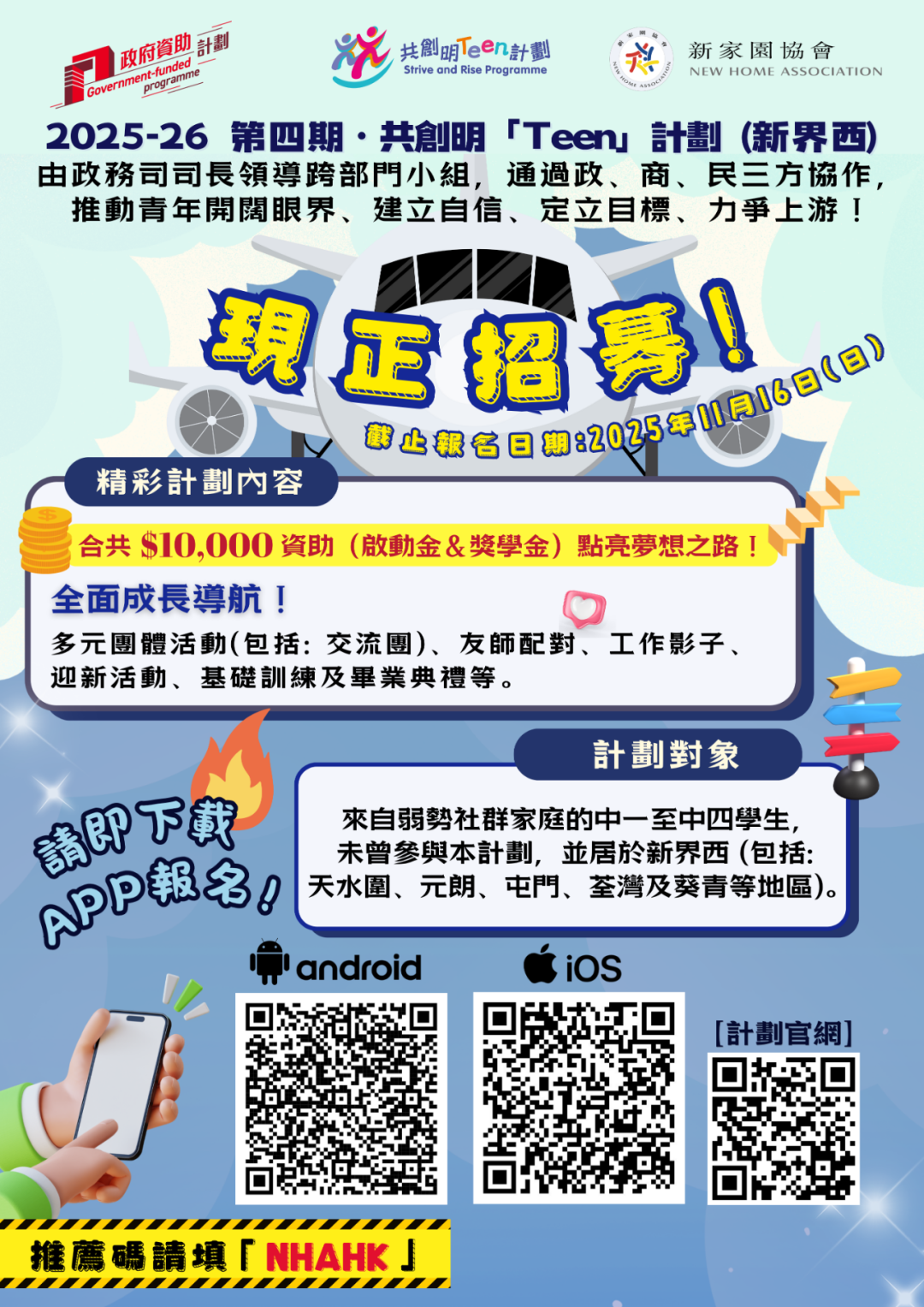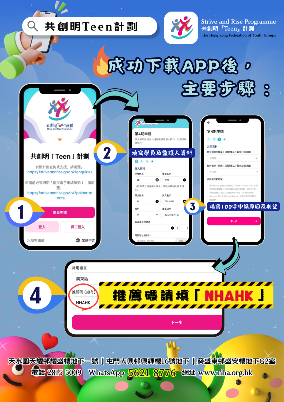 📲 報名方法:透過計劃的手機應用程式(APP)進行申請,下載連結如下:( ‼推薦碼:「NHAHK」)