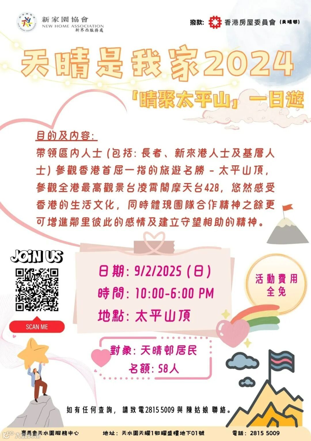 1、 帶領區內人士 (包括: 長者、新來港人士及基層人士) 參觀香港首屈一指的旅遊名勝 – 太平山頂,參觀全港最高觀景台凌霄閣摩天台428,悠然感受香港的生活文化,同時體現團隊合作精神之餘更可增進鄰里彼此的感情及建立守望相助的精神。