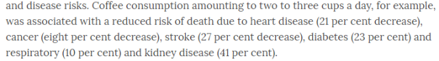 来自国际癌症研究机构的Dr. Marc Gunter 发现,“高咖啡饮用量和降低任何疾病的几率有关,预防循环系统和消化系统的疾病尤为显著”。