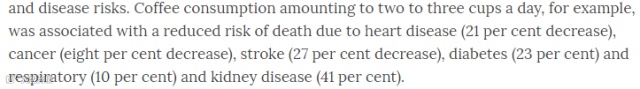 另外,美国科学家对18万来自不同种族的人群调查显示了相同的结果。他们发现尽管种族不同,但是每天喝两至三杯咖啡的人都同样的减少了18%的死亡率。