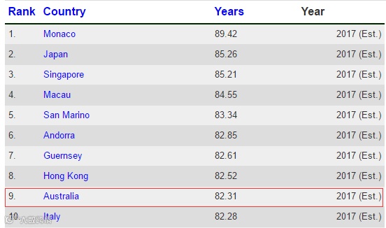 澳洲人均寿命82岁,排名前十,而且这是包括了平均寿命为60岁的澳洲土著的情况下。