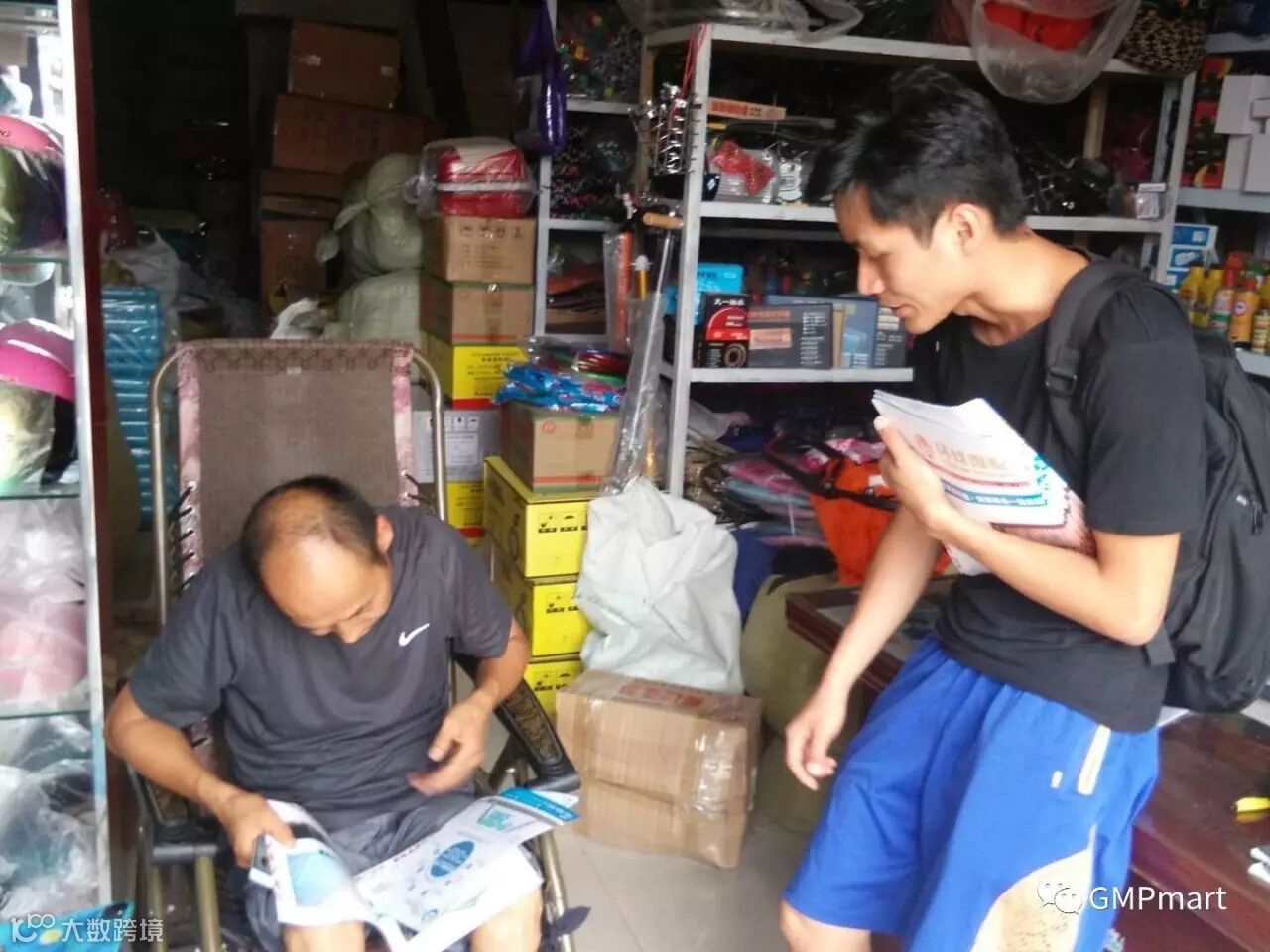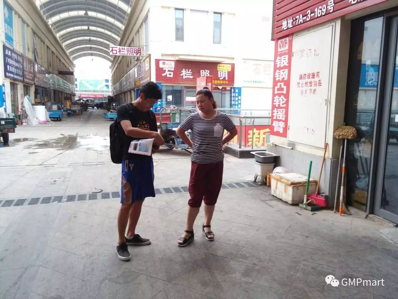 地推人员为客户介绍平台以及九月份的国际摩配展,不仅得到客户的支持,还受到他们的热情款待。客户为工作人员冒着高温辛勤推广表示肯定,极力邀请到档口休息。