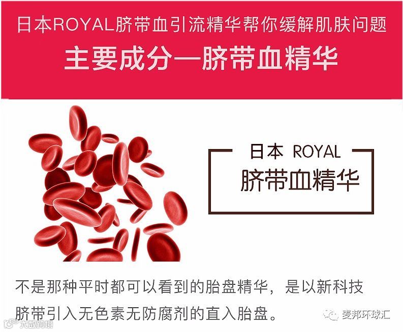 ROYAL脐带血引流精华无色素无防腐剂最具活性 的直入胎盘精华素!醒肤、焕肤、活化、抗氧化、 超强抗衰老、抗皱、平衡肌肤水油平衡、 修复角质层和软化、紧致、恢复年轻水嫩。Royal精华吸收力极强,可以把你之前的保养品逼进皮肤里,用完皮肤紧致有弹性。