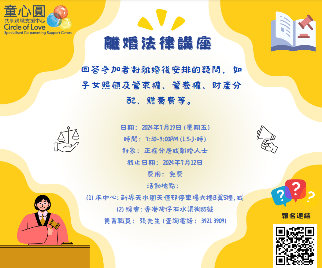 回答參加者對離婚後安排的疑問,如子女照顧及管束權、管養權、財產分配、贍養費等。