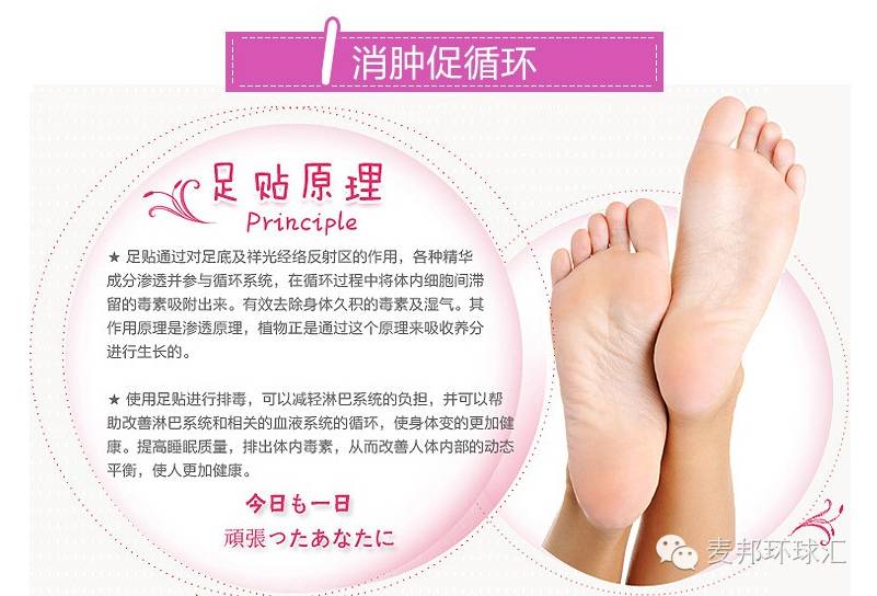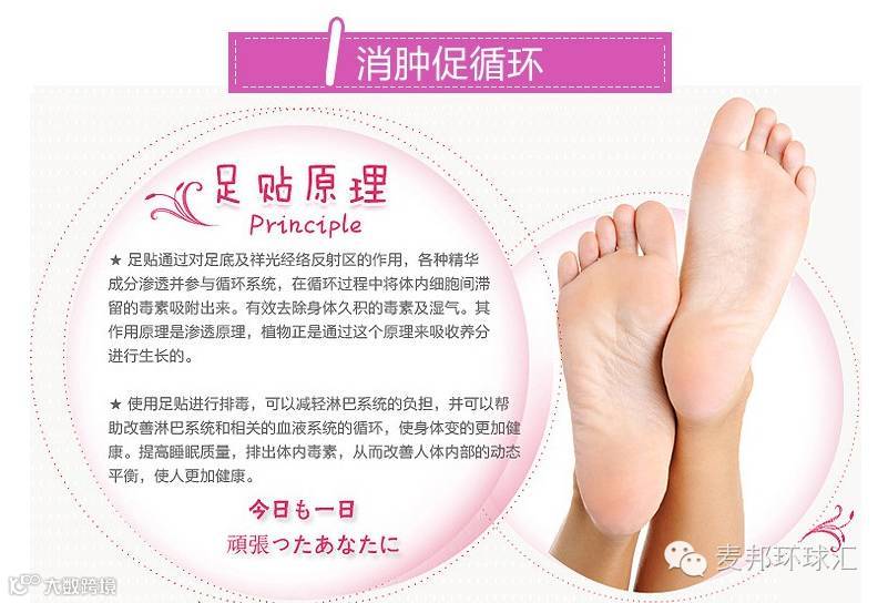 使用足贴进行排毒,可以减轻淋巴系统的负担,并可以帮助改善淋巴系统和相关的血液系统的循环,使身体变的更加健康。足贴可以加强血液循环,加速新陈代谢,提高睡眠质量,排出体内毒素,从而改善人体内部的动态平衡,使人更加健康。