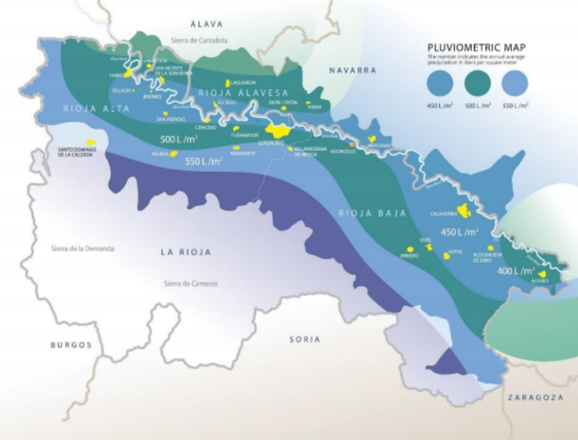 总的来说,里奥哈的气候是温暖的。这个产区收到两种相对气候的影响(大西洋和地中海),有着相对温和的全年均温(12-14摄氏度),冬季寒冷,夏季炎热。根据每个地块具体的情况,全年降雨量在400到600升每平米,分布在一年的各个阶段,其中春冬季节相对潮湿而夏秋季节比较干燥。再配合上充足的阳光,这里的气候很适宜葡萄栽培。葡萄成熟所需要的最低阳光照射时间是1200小时,而里奥哈的年均光照时间能达到2000小时。