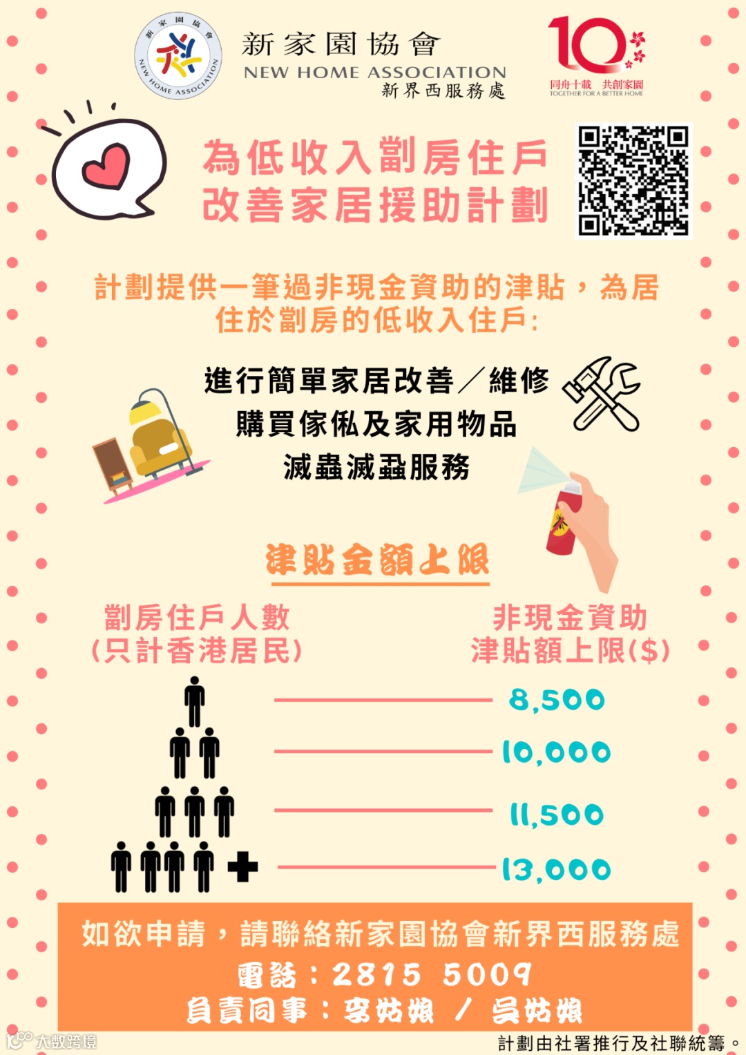 本中心作為獲認可執行單位之一,將為合資格劏房戶申請計劃津貼,希望協助劏房戶改善居住環境。