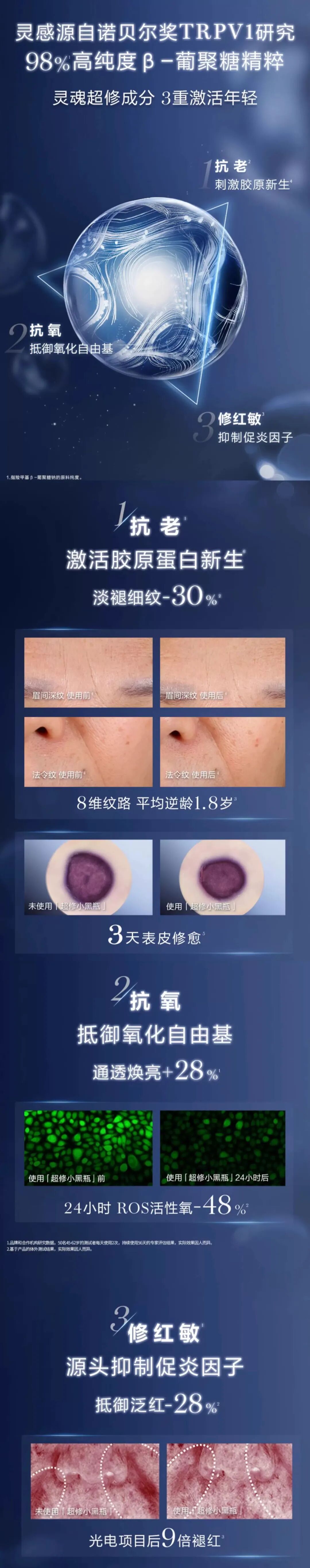 •5大益生元:甘露糖、α - 葡聚糖等调节皮肤菌群平衡,降低敏感肌泛红 率 42%,让敏感肌也能安心享受护肤的快乐。
