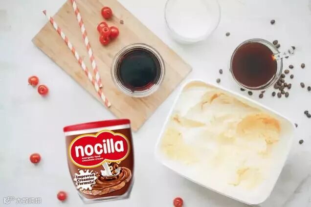 ⑤ 在杯口加一个香草冰淇淋,放上少许nocilla能莱巧克力酱点缀即可