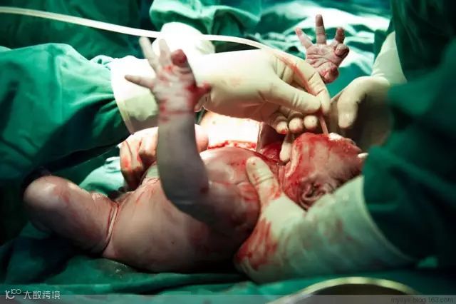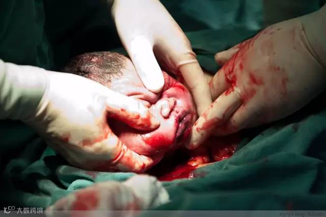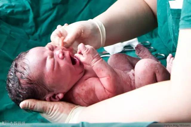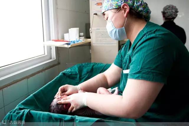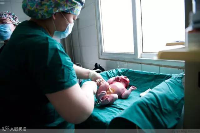 刚刚和母体分离,护士赶紧把孩子嘴里的羊水吸干净