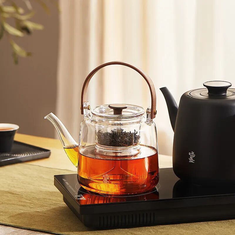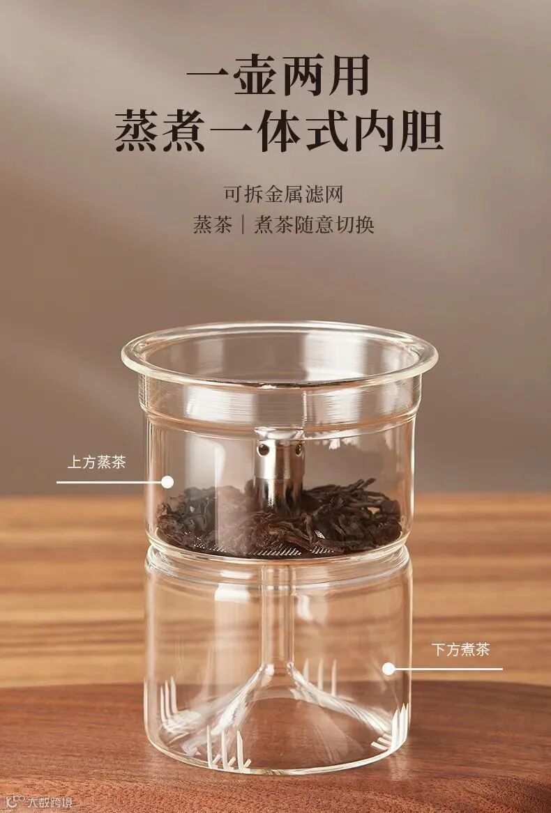 鸣盏玻璃提梁壶,蒸煮一体式内胆,上层蒸茶,下层煮茶,根据茶性随意切换蒸煮方式,还原茶之本真,让蒸煮茶变得简单而专业。