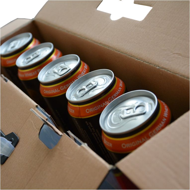 简装礼盒,PVC提手款式,礼盒内托分为两层,每层有一个完全相同的瓦楞纸纸托,每层放置5罐啤酒。