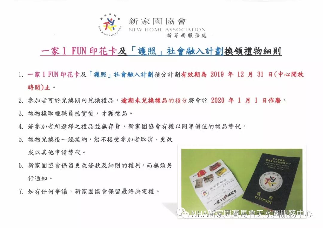 1. 一家1 FUN印花卡及「護照」社會融入計劃積分計劃有效期為 2019 年 12 月 31 日(中心開放時間)止。