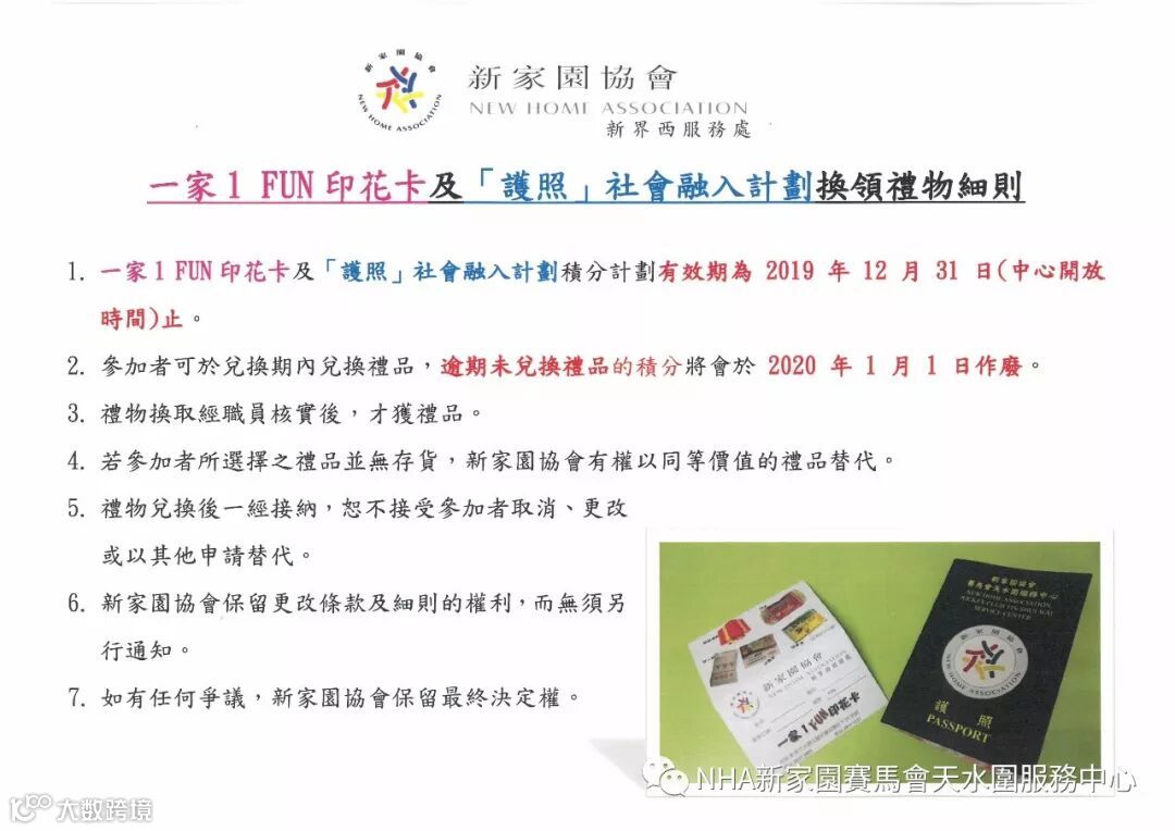 1. 一家1 FUN印花卡及「護照」社會融入計劃積分計劃有效期為 2019 年 12 月 31 日(中心開放時間)止。