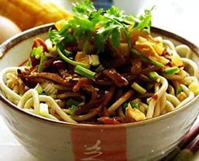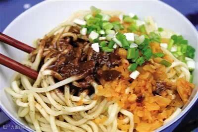 10、将调好的芝麻酱、花生碎榨菜千张丝辣椒油倒在面条上,撒上盐、少许味精醋,再撒上香葱末香菜末拌匀即可.