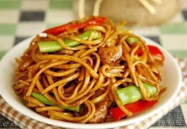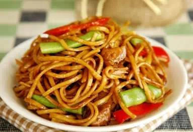 材料:茄子1个,青椒1/2个,素肉20克,拉面1束(约120克)