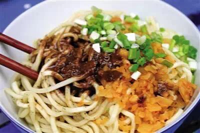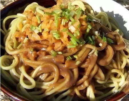 7、将煮好的面条沥干水分,放放入碗内,然后浇上炒好的杂酱。搅拌均匀即可食用。