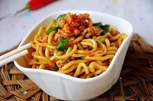 村料:面条200克,猪肉馅400克,芽菜100克,大葱末25克,姜末10克,蒜茸10克,辣椒面1.5克,芝麻酱10克,油菜心1棵,香菜少许。