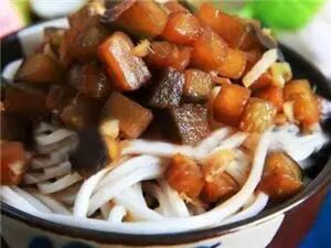 4、加入茄子和青椒,炒匀盛出,浇在面条上食用。