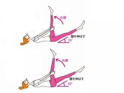 平躺,右脚举成 90度,左脚保持30度的姿势。双手要保住90度的脚,手脚伸直,背部也要伸直,一个动作维持30秒,然后换过来再做一遍。可以训练到腹部的肌肉哦,大腿的肌肉也能得到很好的伸展。