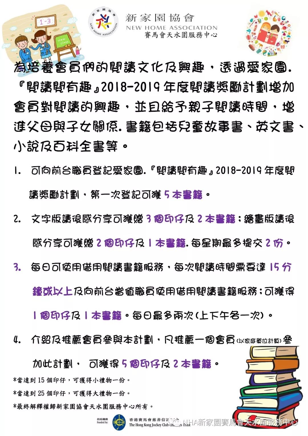 為培養會員們的閱讀文化及興趣,透過愛家園. 『閱讀閱有趣』2018-2019 年度閱讀獎勵計劃增加會員對閱讀的興趣,並且給予親子閱讀時間,增進父母與子女關係. 書籍包括兒童故事書、英文書、 小說及百科全書等。