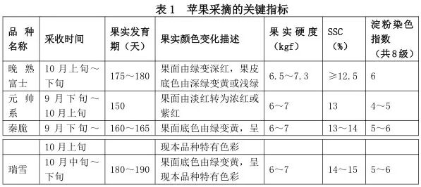 2. 分批采收:对于能够分批采收的果园,遵循“先上后下、先外后内”原则,按着色和成熟度分批采收。关键采摘指标见表 1。