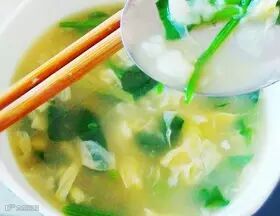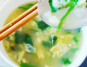 材料:菠菜、鸡蛋、面粉、葱少许、高汤精、盐