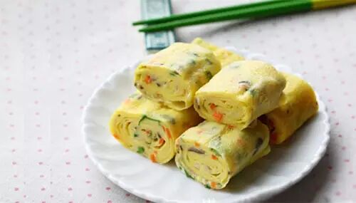 材料:鸡蛋、胡萝卜、葱、火腿肠