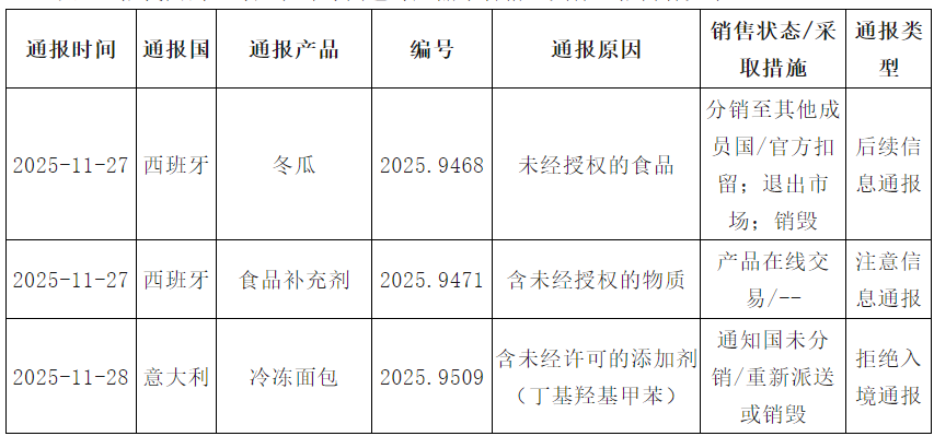 据欧盟食品饲料类快速预警系统(RASFF)消息,2025年11月27日和28日,欧盟通报我国出口冬瓜和冷冻面包等产品不合格。具体通报内容如下: