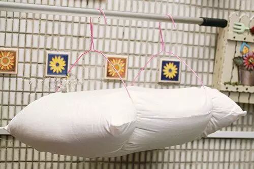 枕头的体积大且蓬松,很难用衣夹夹好晾晒。要解决枕头晾晒的问题,只需运用两个圆形衣架,将枕头套入其中(一左一右),就可以很稳固的平放晾好。