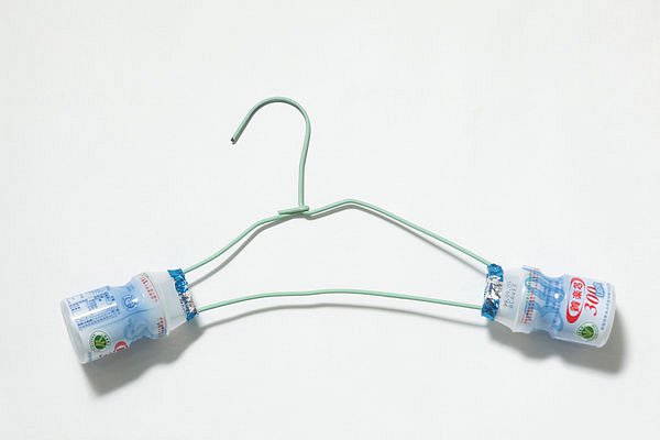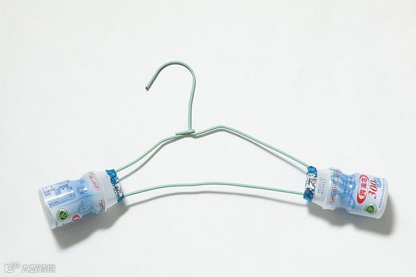 做法:将洗净的两个小空瓶,分别套入衣架的两侧,要稍微用力套入,直到卡紧固定为止。