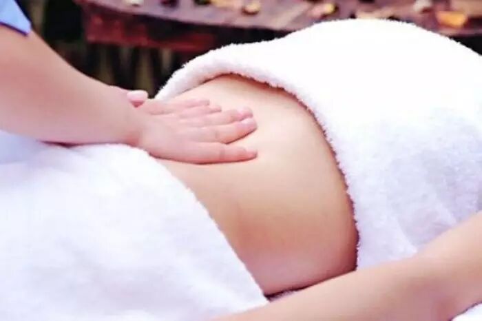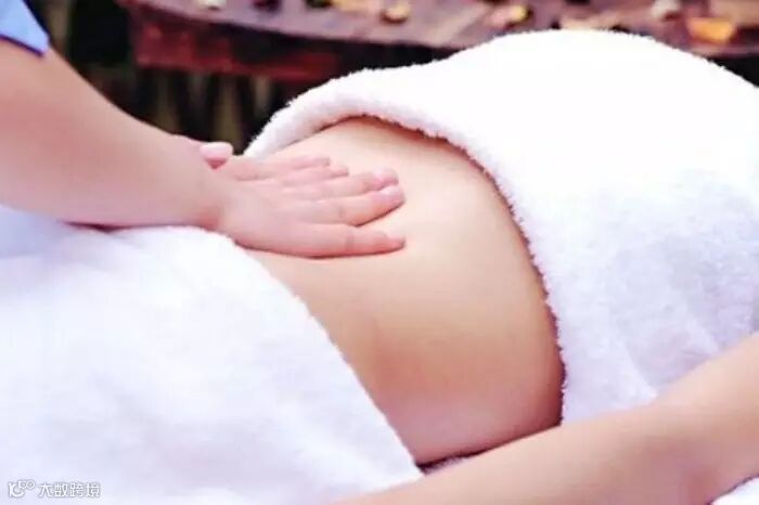 将两手搓热,右手掌心捂在右侧耻骨结节外上,距正中线约2寸的“气海”穴处,左手掌心沿大肠蠕动方向绕脐做圆周运动。