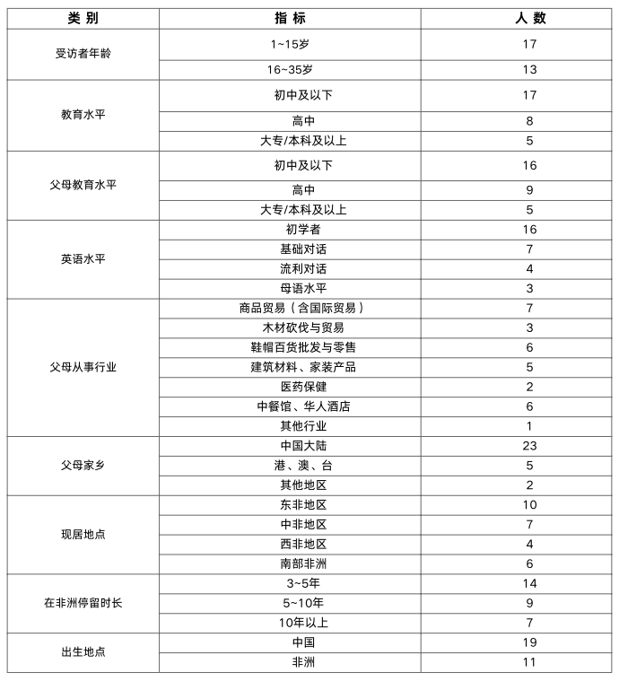 本文资料来源于2018年5月至2023年4月笔者对非洲华商新生代进行的跟踪观察,并对30位非洲华商新生代(及其父母)进行了半结构式访谈。资料搜集方法主要通过网络访谈与国内线下访谈相结合的方式,并通过滚雪球的方式获得受访对象。受访者年龄为35岁以下(15岁以下由其父母代为接受访谈),受教育程度包括小学、初中、高中、大学本科及以上各层次。受访者父母所从事的行业包括商品贸易、木材砍伐与贸易、鞋帽百货、建筑材料、家装产品、医药保健、中餐馆、华人酒店等,他们父母赴非洲的时间为1986年至2016年,而2000年以后到达非洲的人数相对更多,他们父母的教育背景以初中、高中为主。