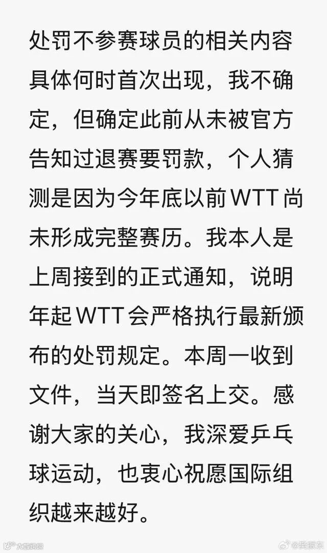 “处罚不参赛球员的相关内容具体何时首次出现,我不确定,但确定此前从未被官方告知过退赛要罚款,个人猜测是因为今年底以前WTT尚未形成完整赛历。”樊振东在个人微博上写道。